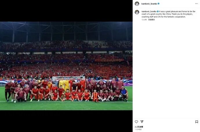 6月29日,伊万科维奇发文谈执教国足。伊万写道:能够担任中国这样一个伟大国家队的教练,我感到非常荣幸和开心。感谢球员们、教练组以及中国足协的出色合作。