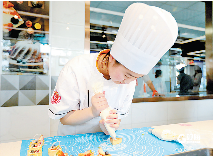 青岛烹饪职业学校的学生在制作糕点。