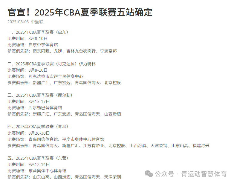 8月3日,CBA公司公布2025年CBA夏季联赛5站比赛的相关信息。其中,夏季联赛青岛站比赛将于8月26日-30日进行,比赛场馆为青岛国信体育馆和平度市奥体中心体育馆,参赛球队为青岛国信海天、新疆广汇、江苏肯帝亚、北京控股、山西汾酒、天津荣钢、山东山高、福建浔兴八支球队。赛事规模是本届夏季联赛5站比赛之最,同时也是继2025年CBA选秀训练营和2025年CBA选秀大会之后,今年夏天青岛举办的第三场有关CBA联赛的大型活动。
