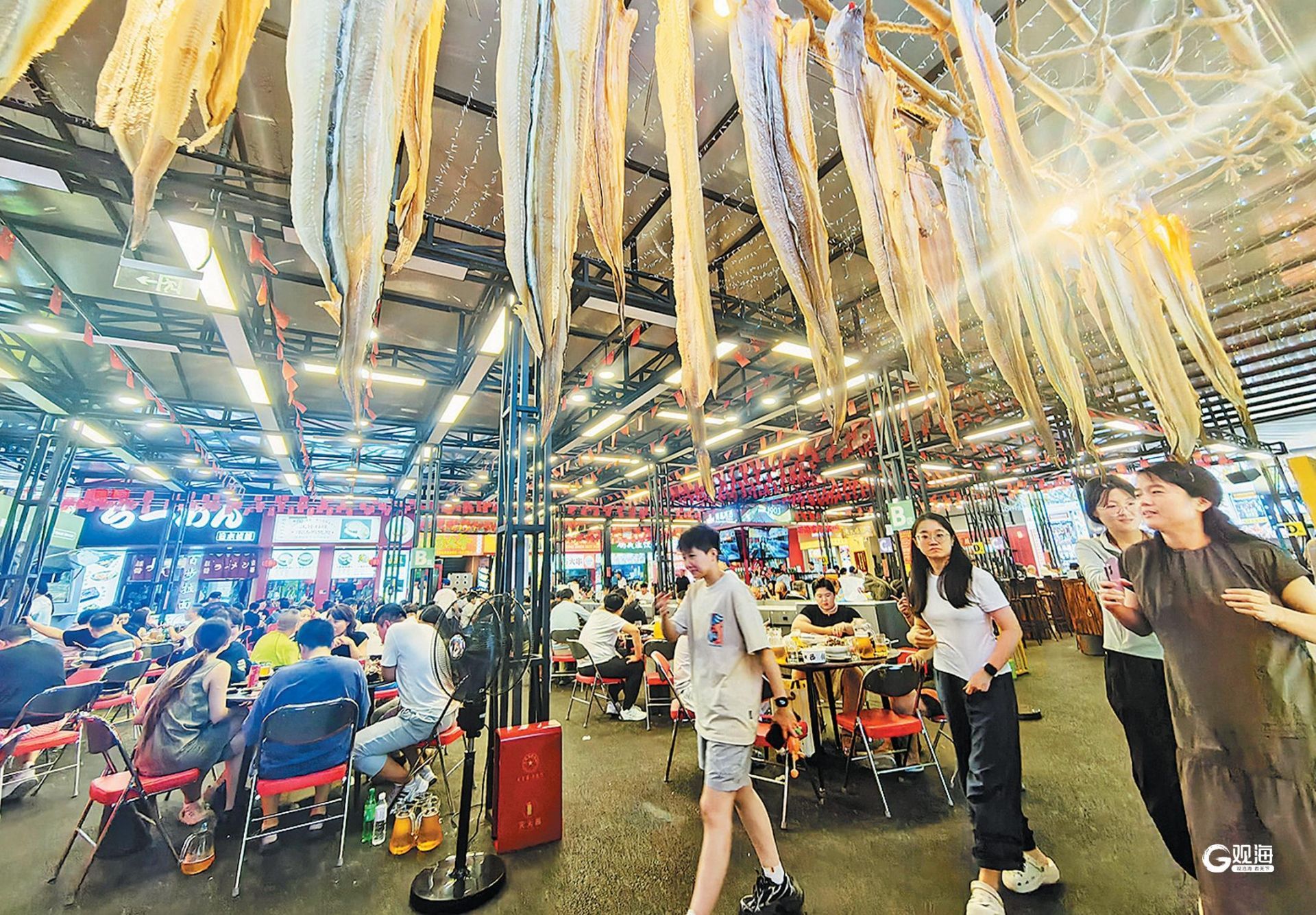 曹掌柜小酒馆、四方大个拉面、小帅帅微波烤肉、小田田烤鱼、西镇臭豆腐……这些青岛传统老字号和新兴网红美食同台竞艳,吸引了不少慕名而来的消费者。记者于7月25日傍晚前去探访,当天正值工作日,不过从下午5点开始,已有消费者陆续进店用餐。晚上7点不到,营业面积超3000平方米的两个大棚已座无虚席。