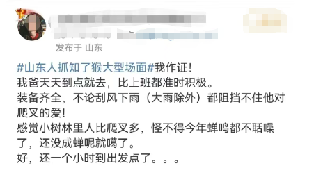 “43天抓了3993只,每天花费七八个小时,能走一万五六千步,体重从156斤瘦到了146斤。平均每天抓知了猴能赚100多块钱,总共收入5000多元,减肥和赚钱两不误。”