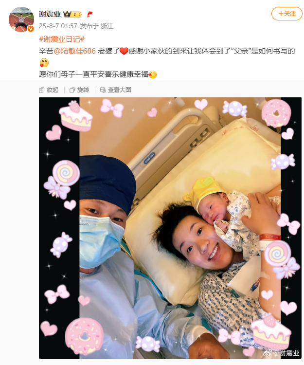 8月7日凌晨,谢震业通过个人微博晒出一家三口合影,称自己正式成为“父亲”。