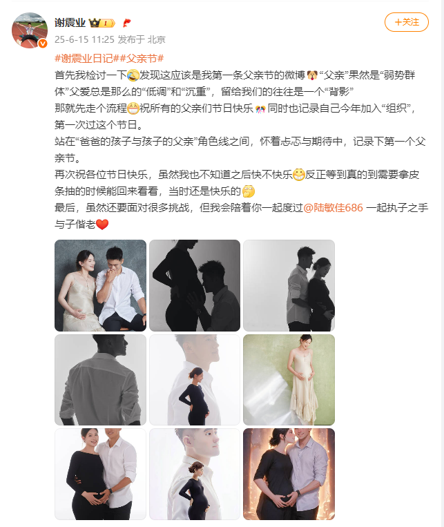 早在今年6月15日,父亲节之际,谢震业便在微博宣布妻子怀孕喜讯,并晒出与妻子的合照。