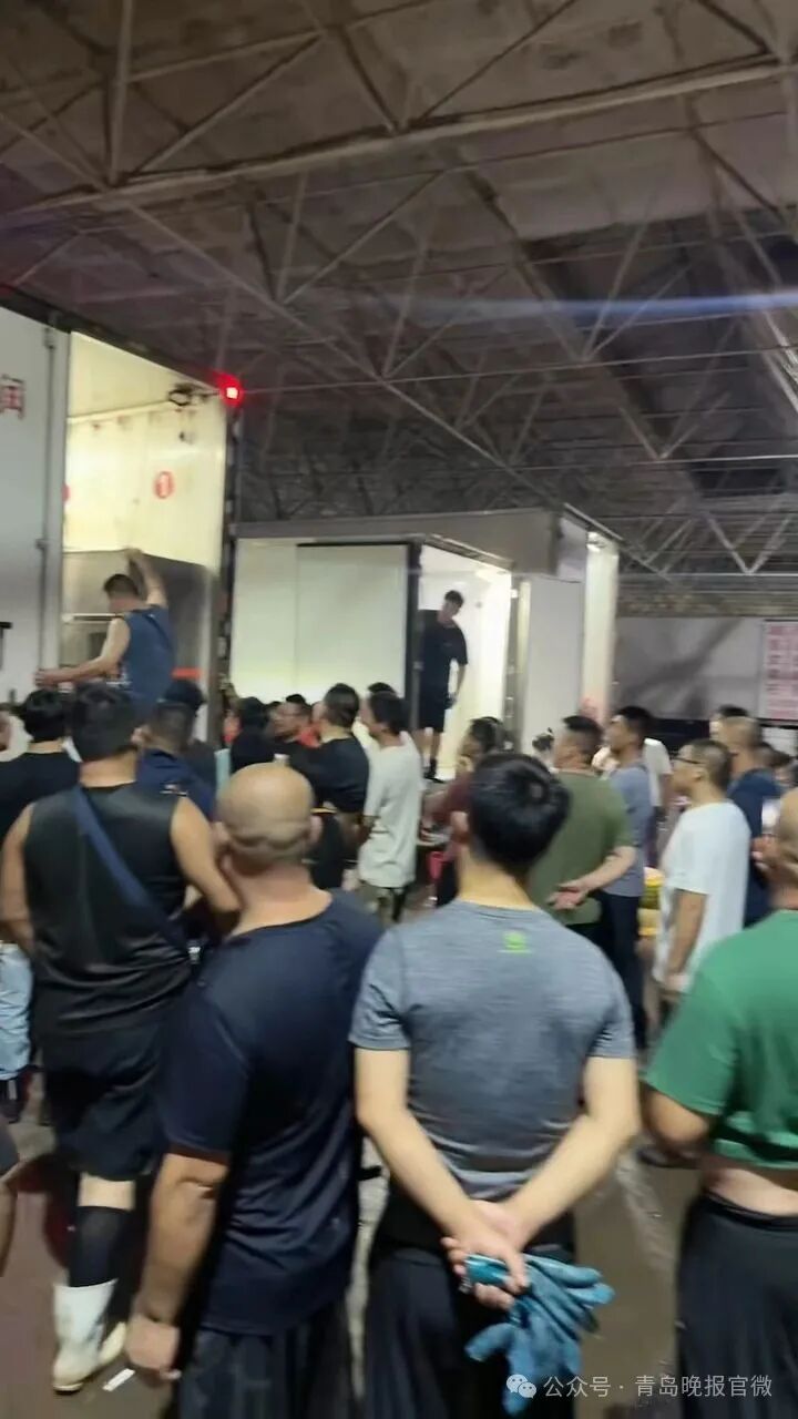 7日凌晨,城阳水产批发市场,几十人围着一辆车等货。
