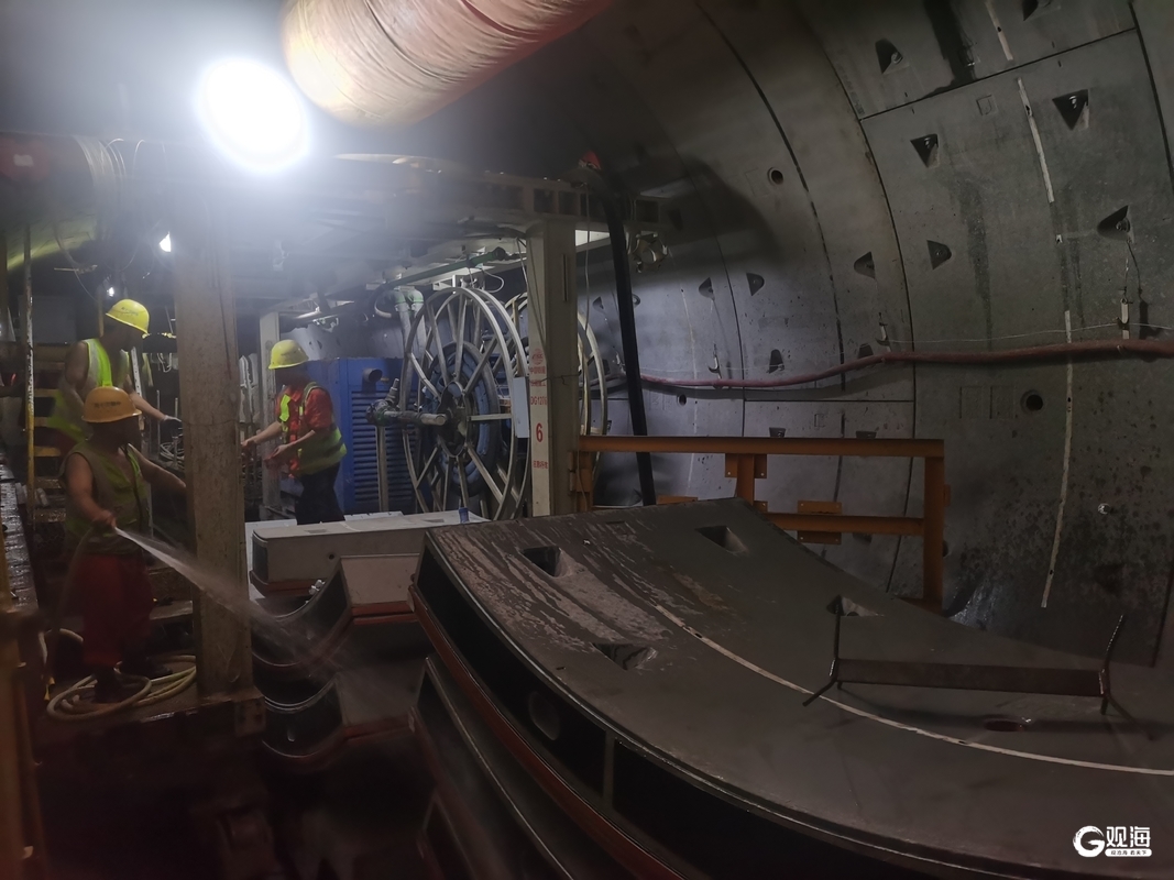 在工作人员的带领下,记者戴上安全帽,顺着竖井来到地下20多米处。这里是盾构区间的施工作业现场,放眼望去,四个巨大的隧洞一一展现在记者眼前。盾构区间施工分为左线和右线。目前,左线隧道盾构掘进速度相对较快,距离贯通只剩下最后几米,预计将在8月中下旬实现双线盾构区间贯通。