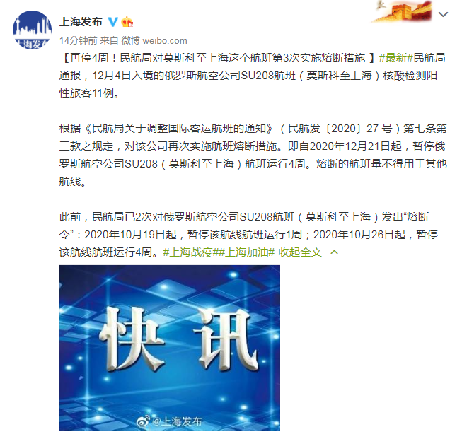 根据《民航局关于调整国际客运航班的通知》(民航发〔2020〕27 号)第七条第三款之规定,对该公司再次实施航班熔断措施。即自2020年12月21日起,暂停俄罗斯航空公司SU208(莫斯科至上海)航班运行4周。熔断的航班量不得用于其他航线。