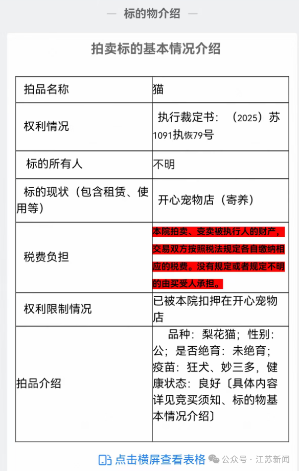 拍卖信息显示:这只3岁的狸花猫为公猫,已打两种疫苗,未绝育,健康状态良好,“已被本院扣押在开心宠物店”。拍卖将于9月3日上午10点开始。