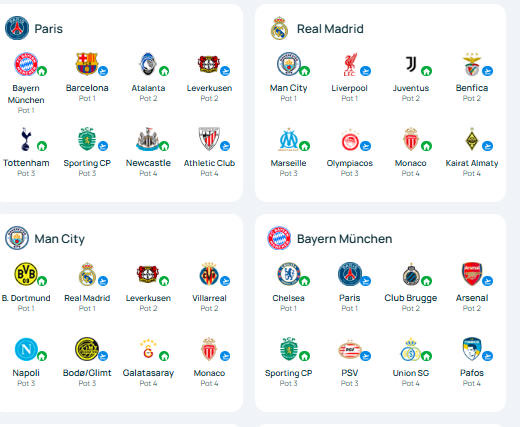 巴黎圣日耳曼队、皇家马德里队、曼城队、拜仁慕尼黑队的抽签结果。