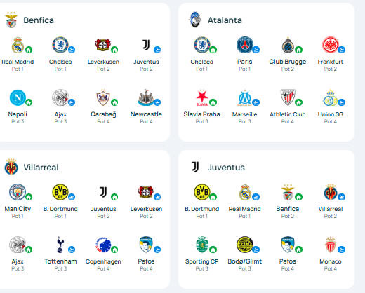 本菲卡队、亚特兰大队、比利亚雷亚尔队、尤文图斯队的抽签结果。
