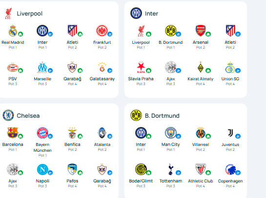 利物浦队、国际米兰队、切尔西队、多特蒙德队的抽签结果。