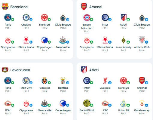 巴塞罗那队、阿森纳队、勒沃库森队、马德里竞技队的抽签结果。
