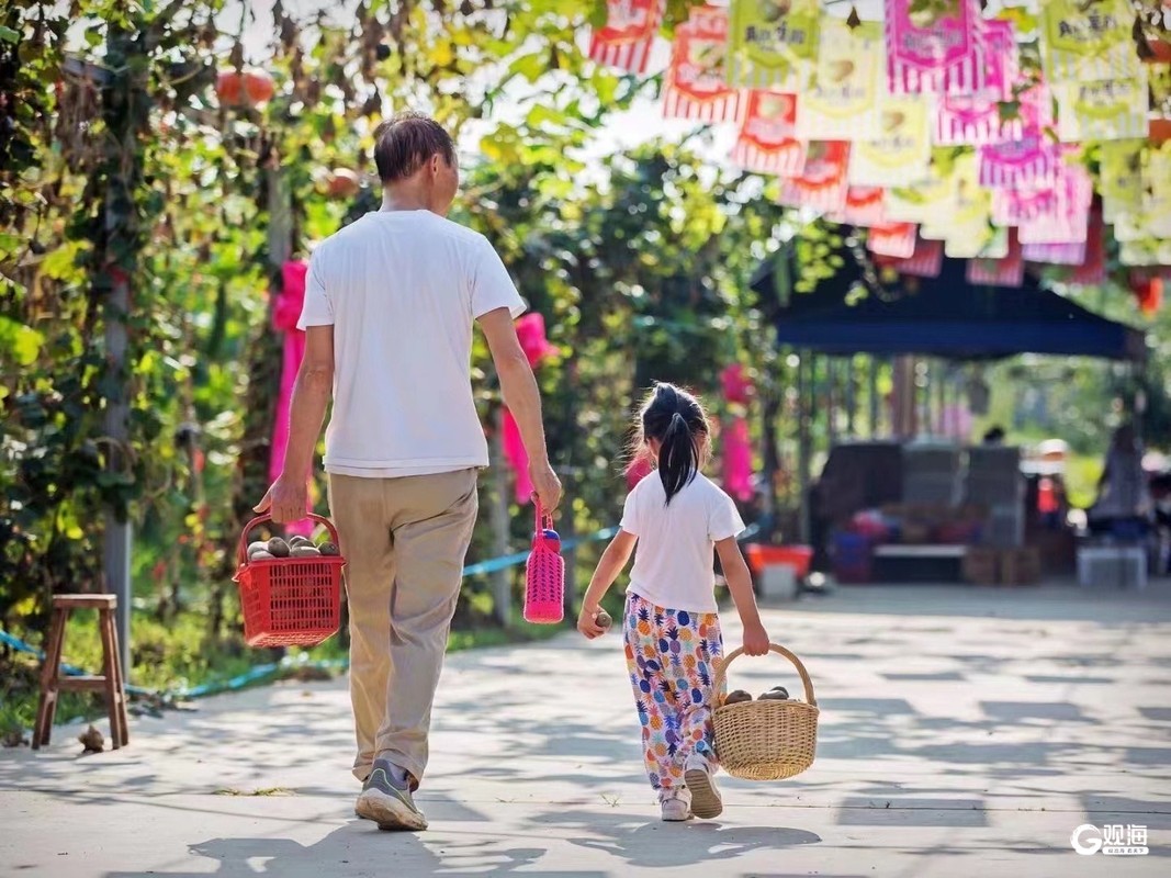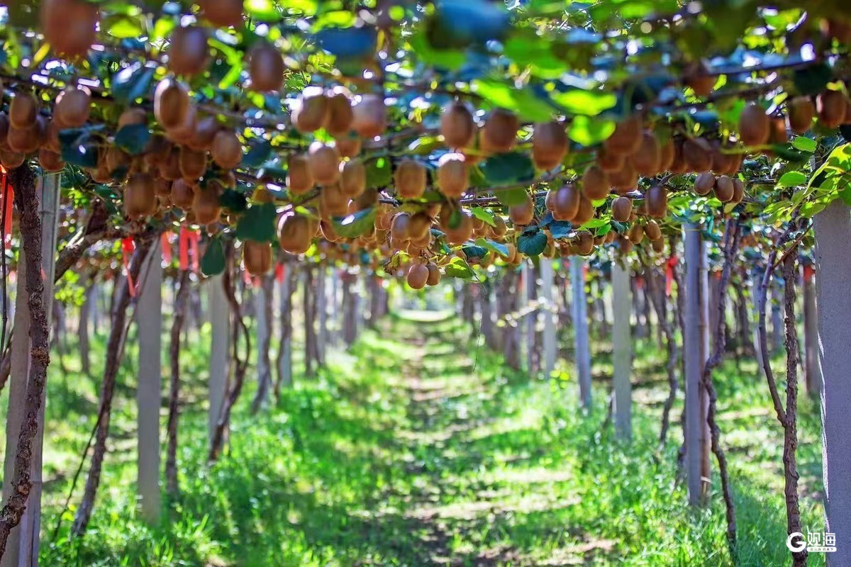 沿着蜿蜒伸展的乡村公路前行至平度市东阁街道紫晶山庄家庭农场。走进果香浓郁的猕猴桃种植采摘园,枝繁叶茂的猕猴桃树连成一片,纵横交错的藤蔓上挂满了果实。不少家长带着孩子前来采摘,他们提着篮筐穿梭在猕猴桃树之间,仔细挑选着果实。