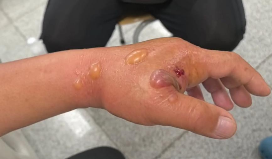 该患者在鱼刺扎伤后的24小时内,辗转多处后来到西院急诊科。从最初左手轻度肿胀,迅速恶化至左手及左上肢显著肿胀,伴张力性水泡、破溃,剧痛难忍,病情凶险且进行性加重,随时面临截肢甚至死亡风险。
