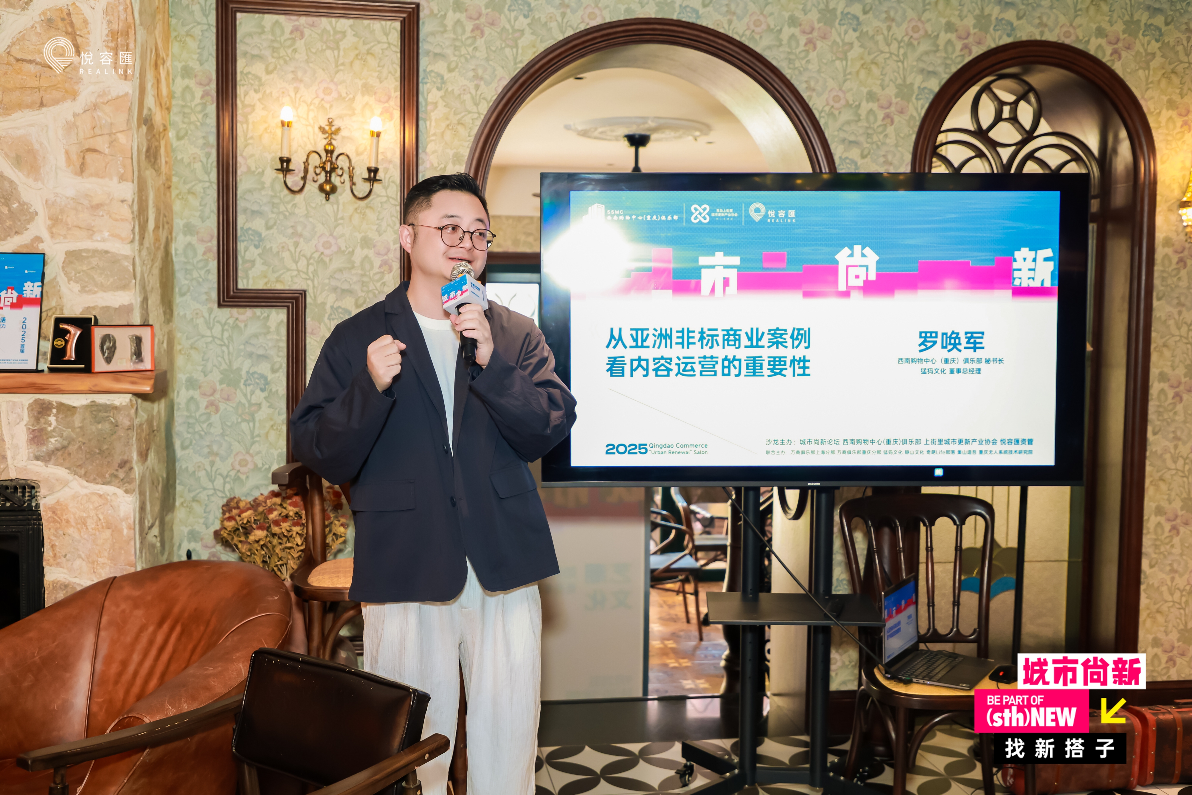 沙龙分享环节,多位嘉宾带来深度洞察与实践分享。西南购物中心(重庆)俱乐部秘书长/猛犸文化董事总经理罗唤军结合国内外成功实践,强调内容运营在差异化竞争中的关键价值;青岛腾远负责人王震铭则提出“上街里的城市更新思路”,建议从城市规划与建筑再生视角推动历史与现代的融合;集山造吾创始人王子力认为,要通过场景营造构建具有记忆点的空间IP;静山文化创始人陈静介绍了借光影技术将文化转化为沉浸式叙事体验的方法;贵阳奇葩LIFE主理人彭公子则从实战出发畅谈个人IP与社群驱动的新商业玩法。