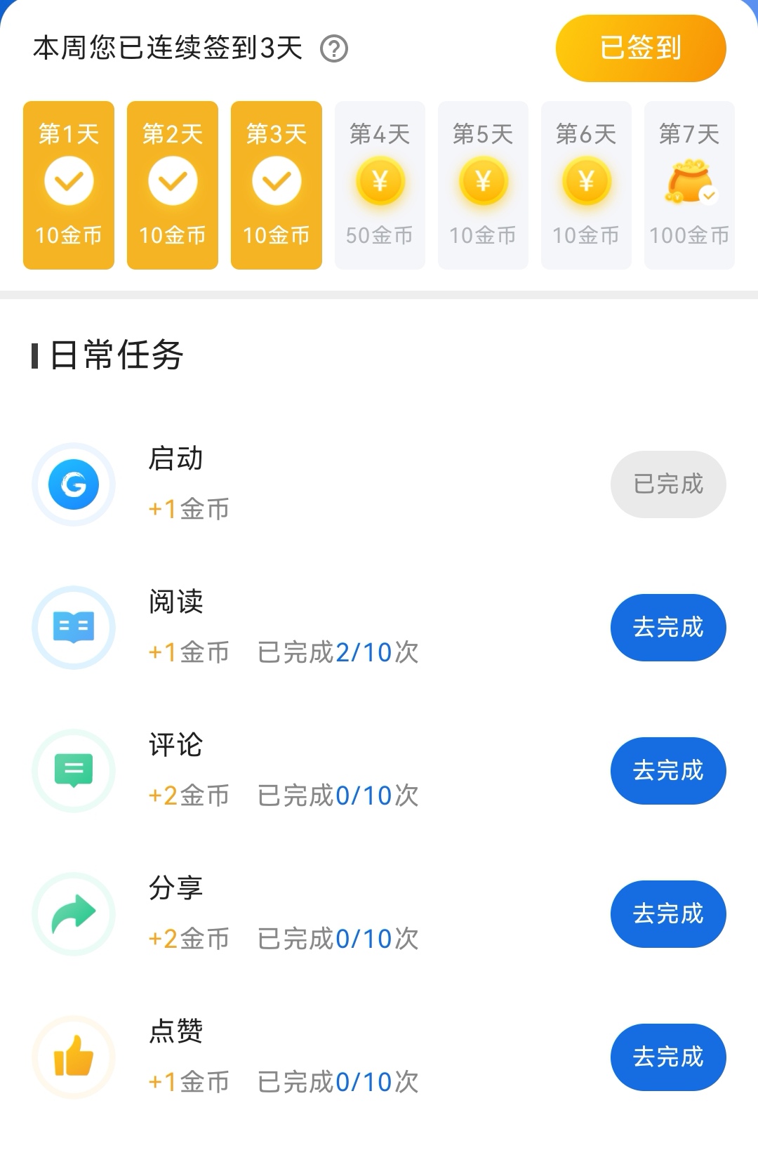 2. 每日互动,财源滚滚。 每天醒来,记得来“我的”页面签个到,连续签到6天,就能一次性收获100金币!读完新闻,顺手留个言、转个发,每天还能再赚金币。