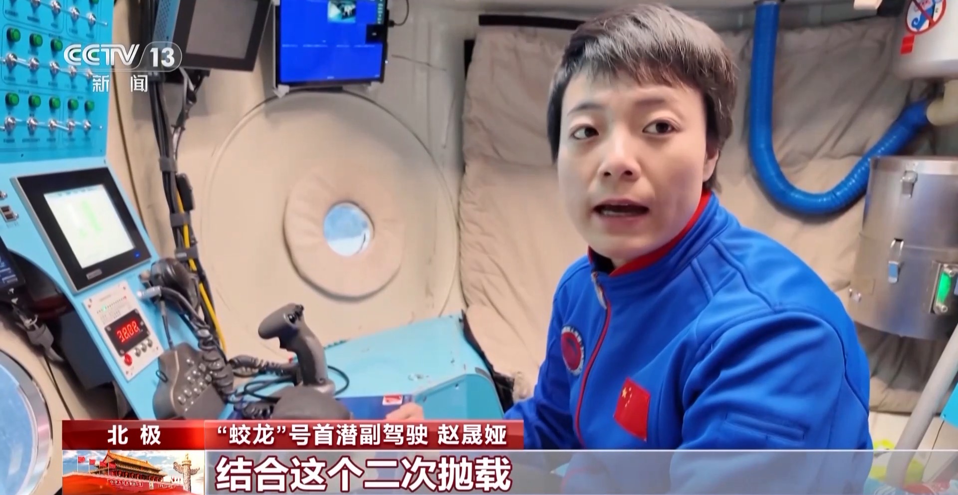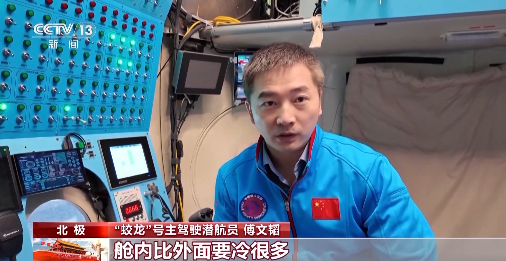 “蛟龙”号主驾驶潜航员 傅文韬:我们在别的地方下潜的话,舱内比外面的话要冷很多,但是北极不一样,我们进来的时候穿多少,到底下也是穿多少。也是会做很多准备工作,把每个潜次的任务完成好。