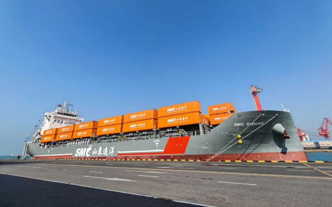 首航的“SMC RIZHAO”轮,为山东港口自主建造的智能化集装箱船,船长118米,型宽20.8米,最大载箱量712标箱,具备多用途船与普通干货船双船型功能,可承运普通集装箱、冷藏集装箱、包装货及大件设备。