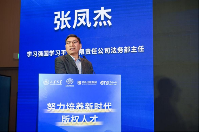 在专题演讲环节,学习强国学习平台有限责任公司法务部主任张凤杰以数智时代版权文化建设与相关人才培养为题,强调版权文化是产业发展的根基,人才培养应注重文化认同与制度理解。