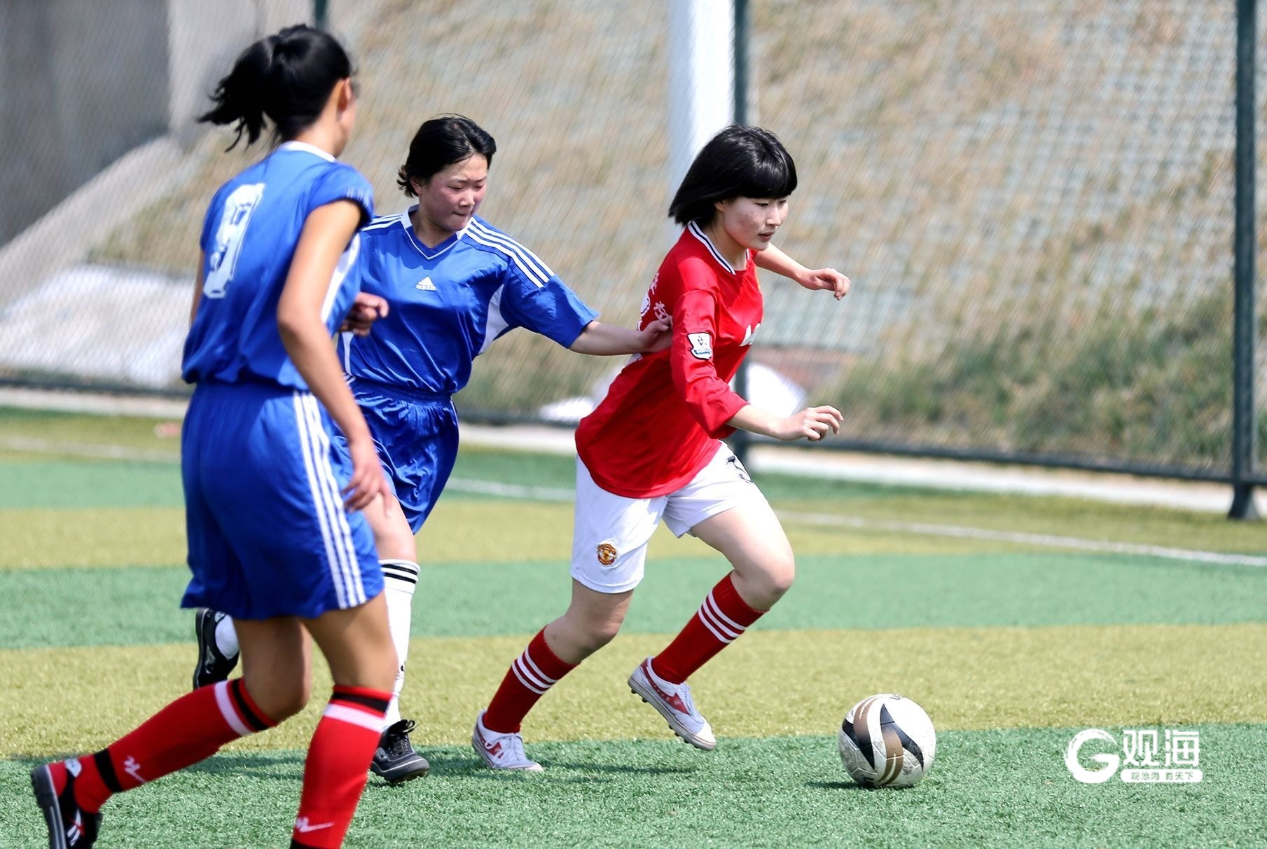 女足运动员在赛场上展现巾帼不让须眉的风采。