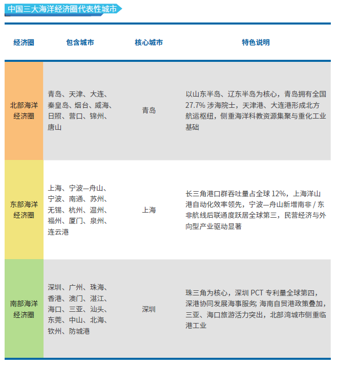 在海洋强国战略背景下,中国已形成三大海洋经济圈,分别是北部海洋经济圈、东部海洋经济圈和南部海洋经济圈,青岛、上海、深圳分别成为这三大经济圈的核心引领者。