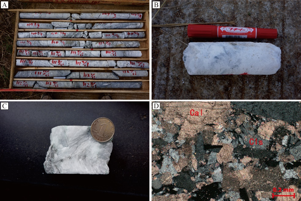 麻山头锶矿区天青石矿石照片(A,B,C-矿石照片,D-镜下照片,Cal-方解石,Cls-天青石)江苏省地质调查研究院供图