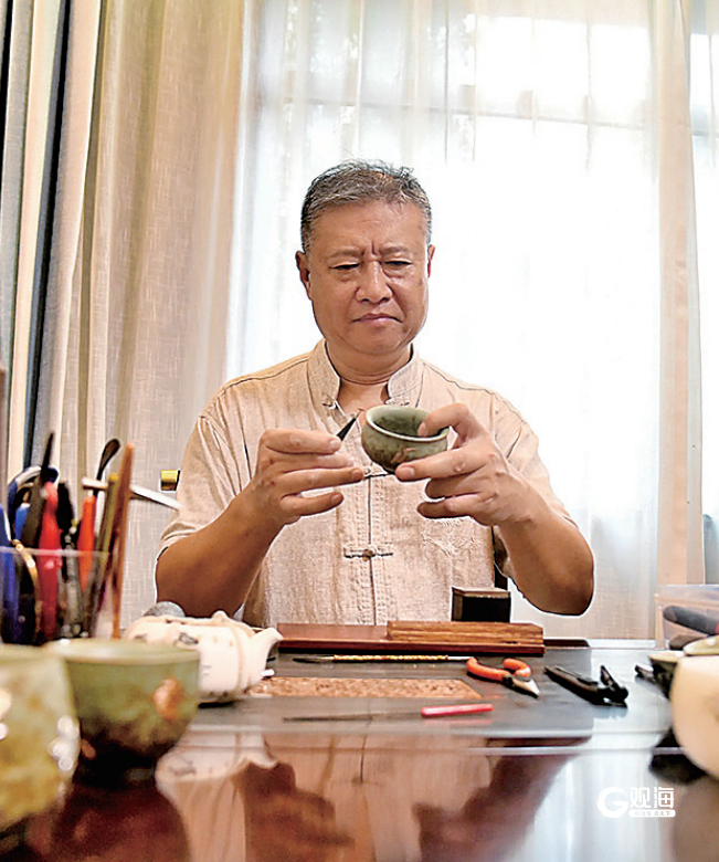 其实对周华而言,让修复后的器物“滴水不漏”并非难事,但他更追求让残缺器物实现艺术升华,赋予其独一无二的视觉生命。这份对锔瓷美感的执着,源于他心中的责任:待修的老物件凝聚着老匠人的心血与主人的爱惜,修复它们不仅是修补器物,更是“缝补生命”。