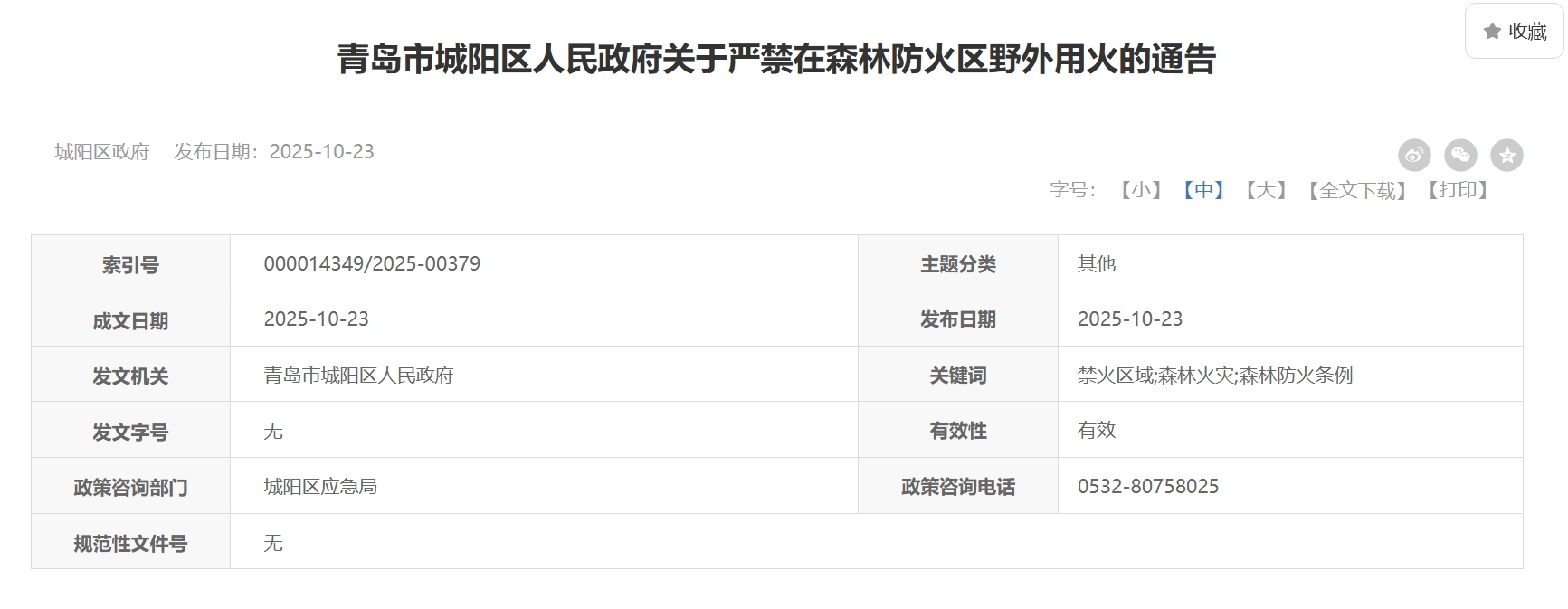 青岛日报社/观海新闻10月23日讯 10月23日,青岛市城阳区人民政府发布关于严禁在森林防火区野外用火的通告。明确禁火时间自2025年11月1日起至2026年5月31日止,禁火区域为城阳区所辖行政区域内所有森林及其边缘500米范围内。