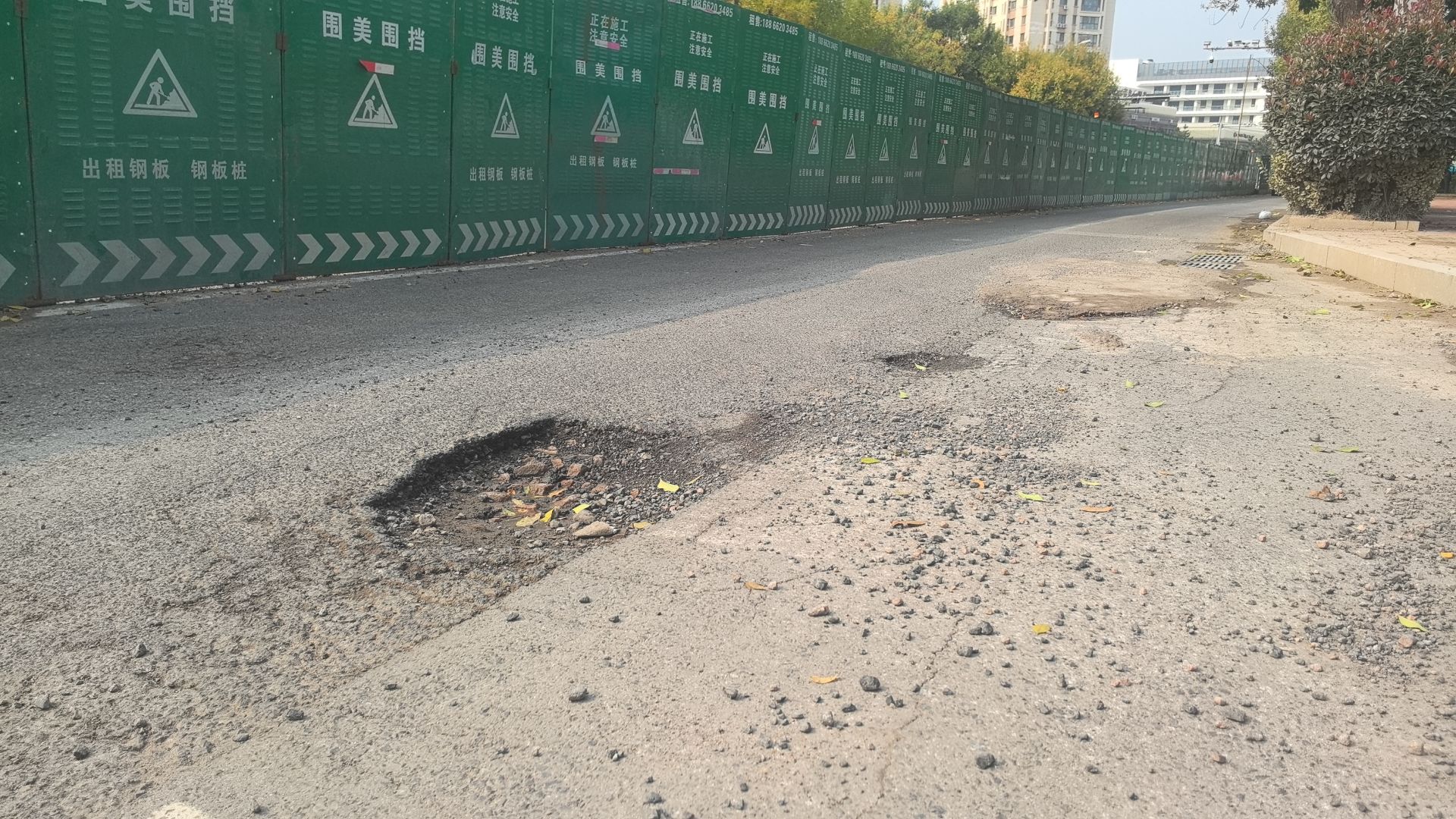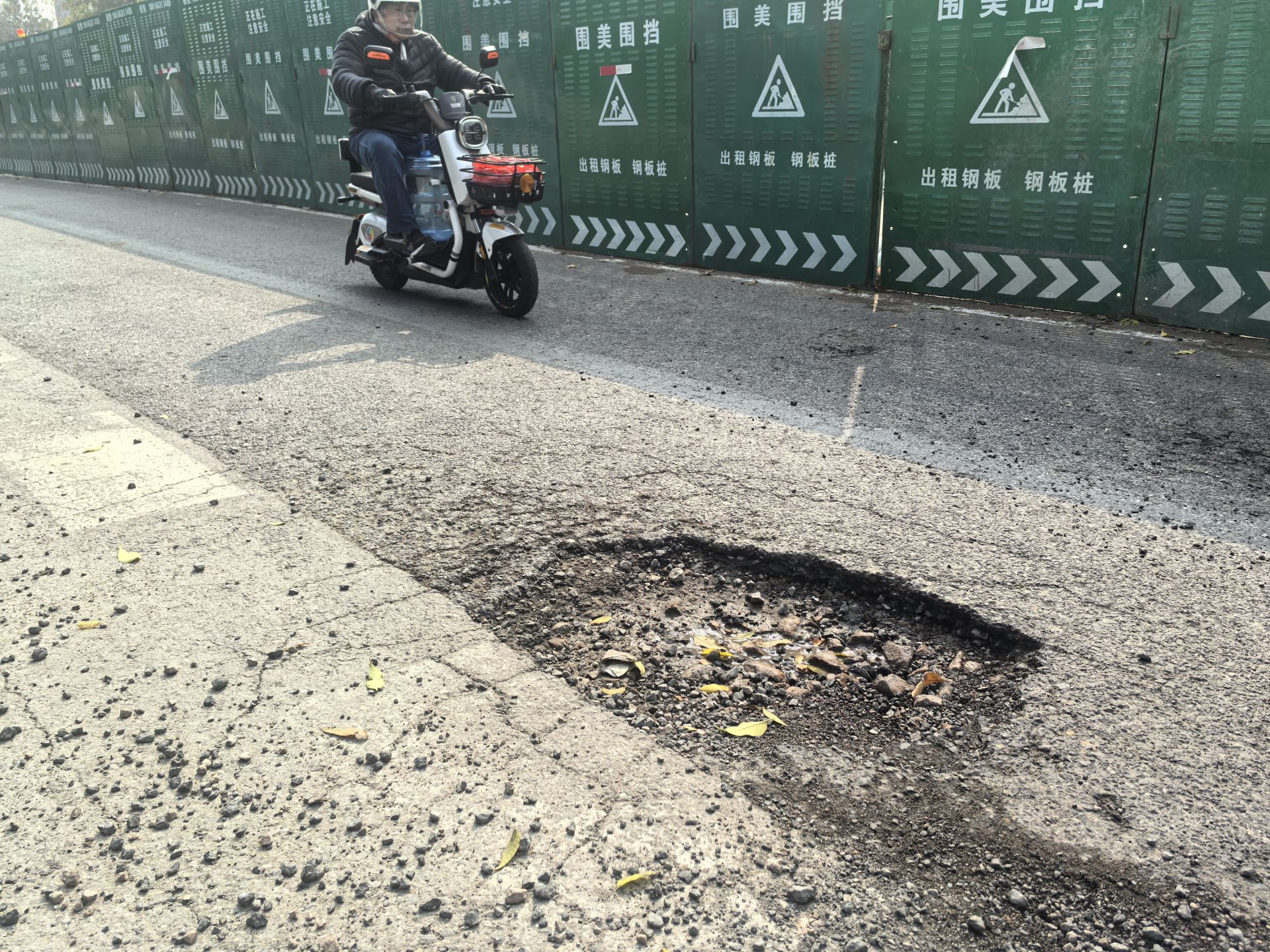 记者近日在现场看到,该处坑洼位于常宁路北半幅行车道,面积约0.3平方米,深约20厘米,旁边还有一处面积稍小的坑洼。由于常宁路正在掘路施工,北半幅道路仅有一条车道,过往车辆稍不注意,就会碾压到坑洼处,造成车辆颠簸。一位正在常宁路宁乡路公交站候车的市民告诉记者,早晚高峰时段,常宁路过往车辆较多,希望有关部门能尽快修补这些坑洼处。
