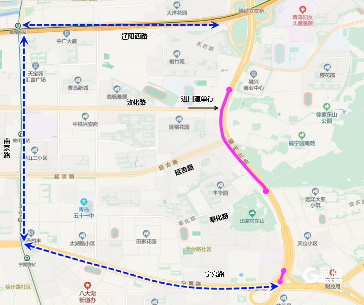 施工期间,由于部分车道被占用,道路通行能力有所下降。为缓解施工路段的交通压力,建议市民优先选择“地铁”或“公交+地铁”的公共交通方式出行。驾车市民建议沿辽阳西路→南京路→宁夏路绕行,绕行距离约2公里。(青岛日报/观海新闻记者 王冰洁)
