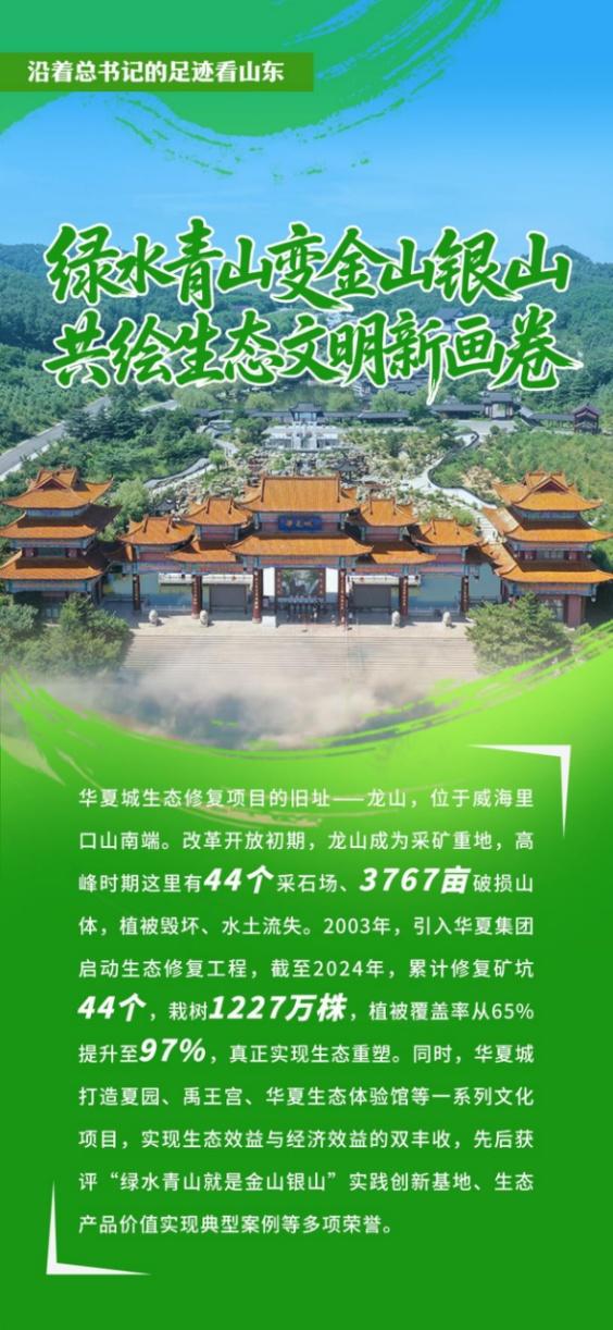 2018年6月12日,习近平总书记视察威海华夏城时指出:“良好生态环境是经济社会持续健康发展的重要基础,要把生态文明建设放在突出地位,把绿水青山就是金山银山的理念印在脑子里、落实在行动上。”,并殷切嘱托“方兴未艾,再创佳绩”。七年多来,威海市始终牢记总书记嘱托,坚定不移走生态优先、绿色发展之路,将一片矿坑废墟转变为国家5A级旅游景区,成为“绿水青山就是金山银山”实践的鲜活样本。