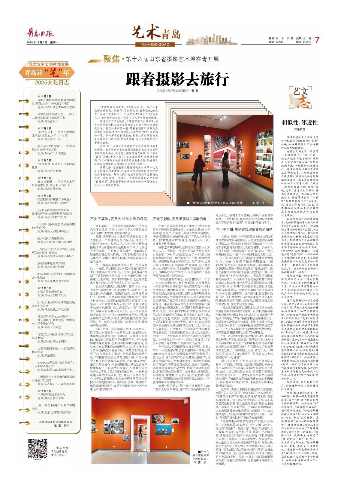 今年以来,多项摄影展在青岛开展。近日,与第十六届山东省摄影艺术展同步开展的还有2025青岛市摄影艺术展暨第十届百姓摄影节。望文生义,这项拥有广泛百姓基础的摄影节,用镜头定格时代,以影像讲述青岛。参赛作品需取材于青岛市,有青岛的自然风光,也有人文景观,还有聚焦青岛的社会发展,如城市建设的新成就、科技创新的新突破等。在展览上,城市建设、海洋经济、乡村振兴、生态环境、民俗文化、百姓生活等“以图说城”的大美摄影作品,呈现出一种置身电影中的浪漫与澎湃。