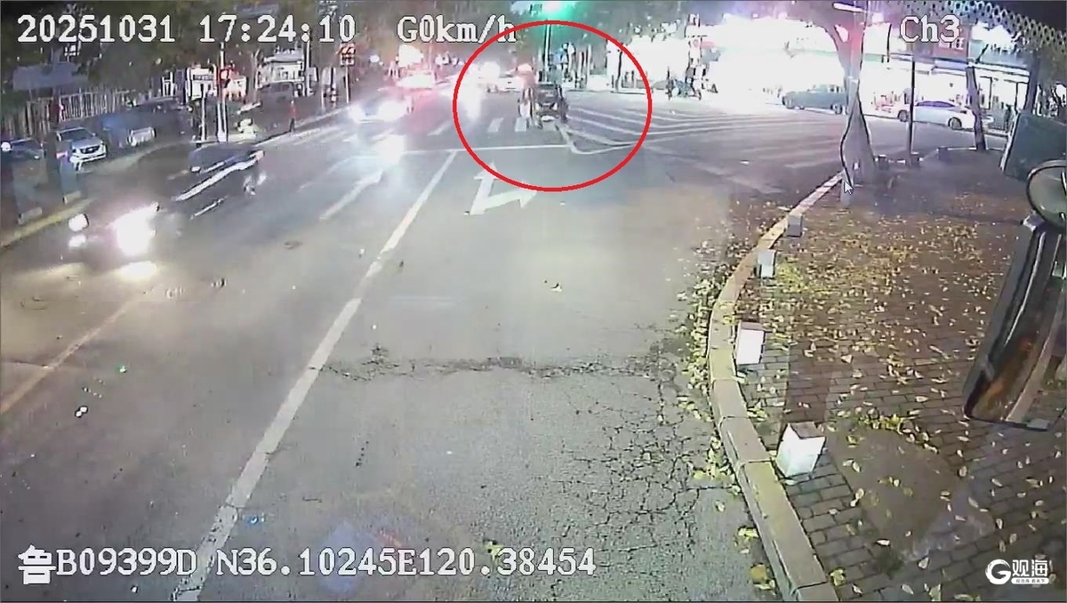 10月31日17时23分,正值青岛晚高峰时段,城市主干道上的车流如织,缓慢前行。于爱忠如往常一样执行营运任务,当车辆行驶至伊春路与绍兴路交叉口时,前方右转车道上一辆停滞不前的残疾人三轮车引起了他的警觉。