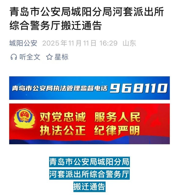 青岛日报社/观海新闻11月12日讯 青岛市公安局城阳分局河套派出所综合警务厅搬迁通告11日发布。河套派出所户政业务窗口将于2025年11月15日搬迁新址,新址为青岛市城阳区龙海路632号(河套交警中队西侧、原海岸警察支队龙海路派出所综合警务厅)。
