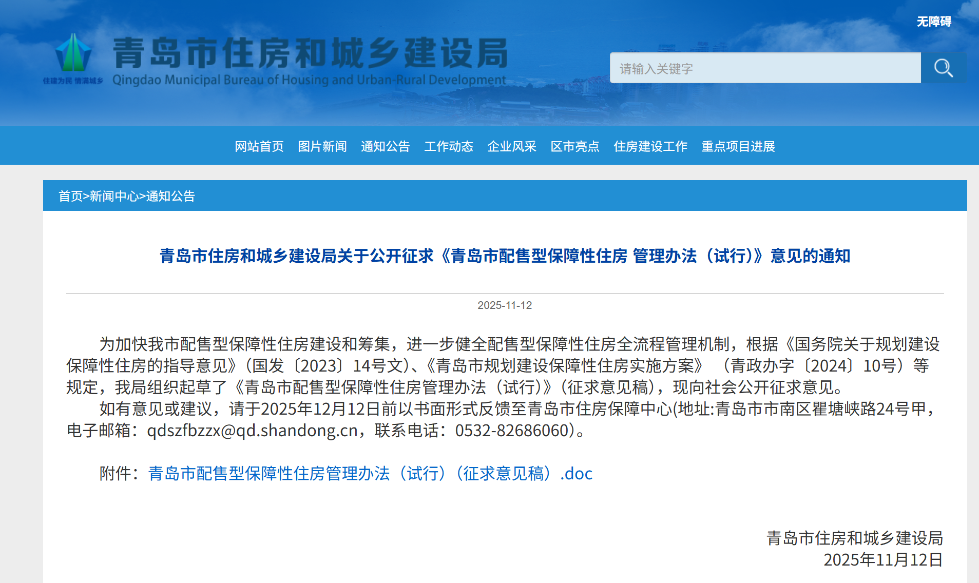 青岛日报社/观海新闻11月13日讯 近日,青岛市住房和城乡建设局发布《青岛市配售型保障性住房管理办法(试行)》(以下简称《办法》)的征求意见稿,共32条,从保障对象和标准、规划建设、配售管理、封闭管理、监督管理5个方面强化管理。
