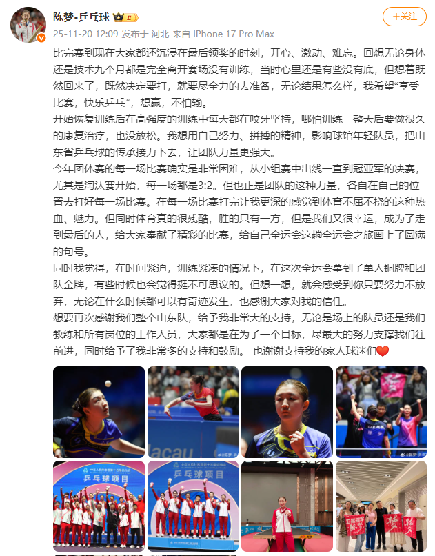 今年团体赛的每一场比赛确实是非常困难,从小组赛中出线一直到冠亚军的决赛,尤其是淘汰赛开始,每一场都是3:2。但也正是团队的这种力量,各自在自己的位置去打好每一场比赛。在每一场比赛打完让我更深的感觉到体育不屈不挠的这种热血、魅力。但同时体育真的很残酷,胜的只有一方,但是我们又很幸运,成为了走到最后的人,给大家奉献了精彩的比赛,给自己全运会这趟全运会之旅画上了圆满的句号。
