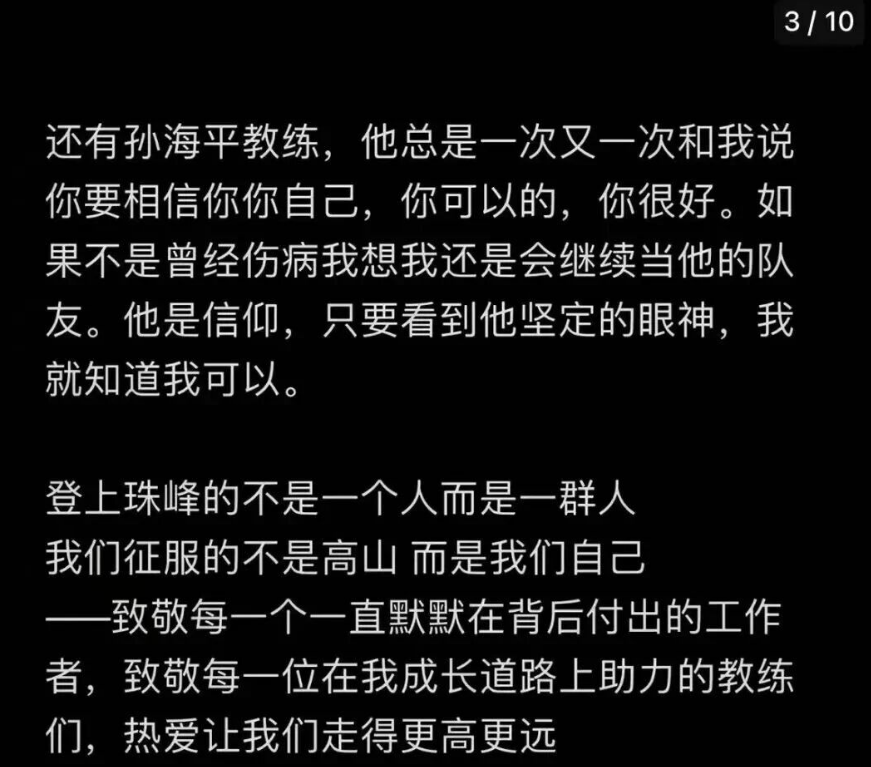 刘景扬表示,“登上珠峰的不是一个人,而是一群人。我们征服的不是高山,而是我们自己。致敬每一个一直默默在背后付出的工作者,致敬每一位在我成长道路上助力的教练们,热爱让我们走得更高更远。”