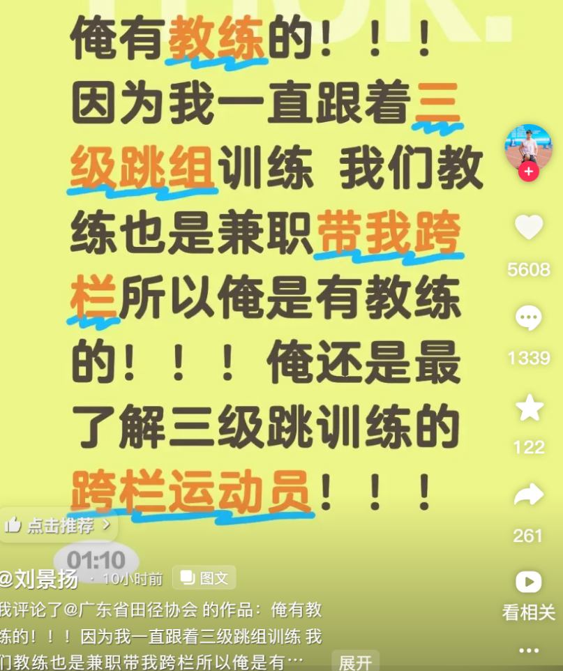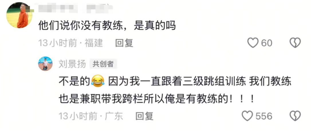 今天(11月20日)凌晨,刘景扬在社交平台发文称,“我是有教练的。因为我一直跟着三级跳组训练,我们教练也是兼职带我跨栏,所以我是有教练的!我还是最了解三级跳训练的跨栏运动员!”