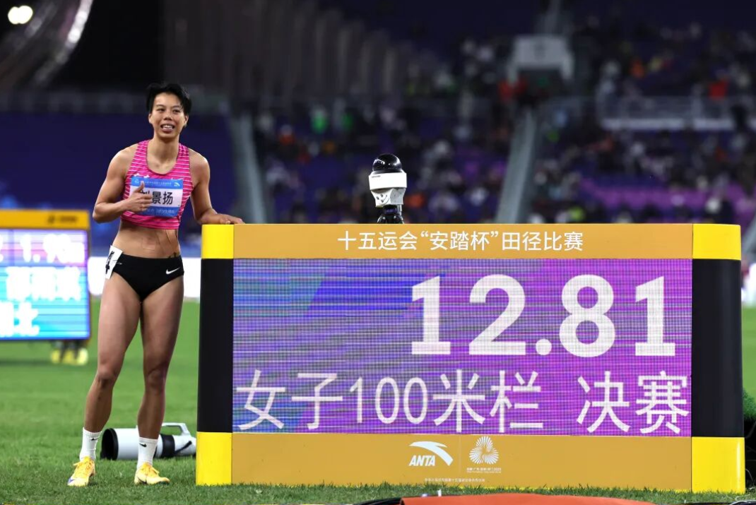 11月19日晚,十五运会田径比赛女子100米栏决赛中,东道主选手刘景扬刷新个人最好成绩,以12秒81的成绩夺得金牌。