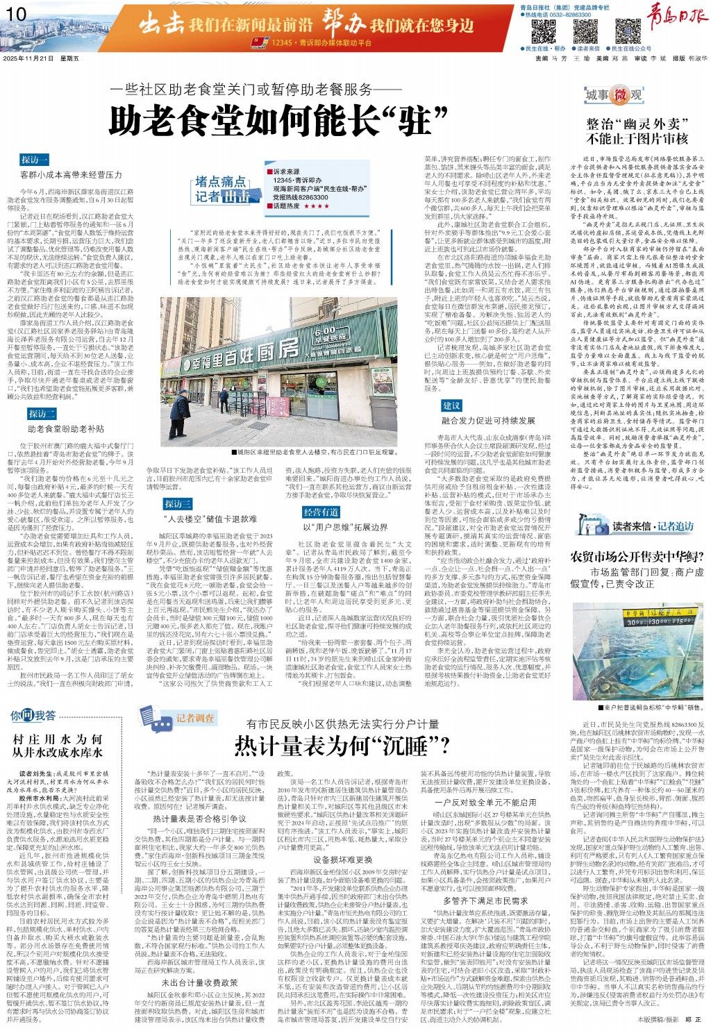 “家附近的助老食堂本来开得好好的,现在关门了,我们吃饭很不方便。”“关门一年多了还没重新开业,老人们都翘首以盼。”近日,多位市民向党报热线、观海新闻客户端“民生在线·帮办”平台反映,岛城部分社区助老食堂出现关门现象,老年人难以在家门口吃上助老餐。