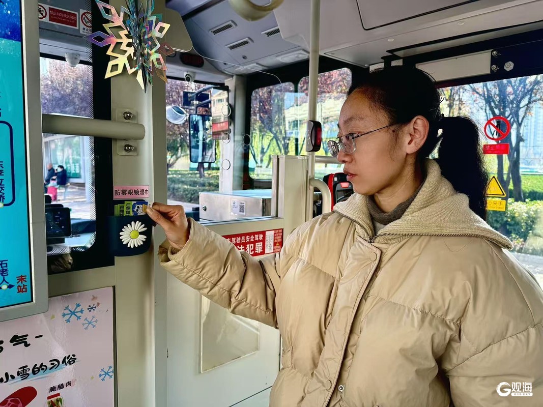 因室内外温差较大,崔立群还贴心准备了防雾眼镜湿巾,帮助戴眼镜的乘客解决上下车时镜片起雾的“小尴尬”。考虑到小雪节气后降雪可能性增加,为保证乘客的出行安全,崔立群未雨绸缪,在车厢内铺设了节气主题的防滑地贴,同时在扶手杆上设置了防滑套,确保雨雪天气乘客乘车安全。