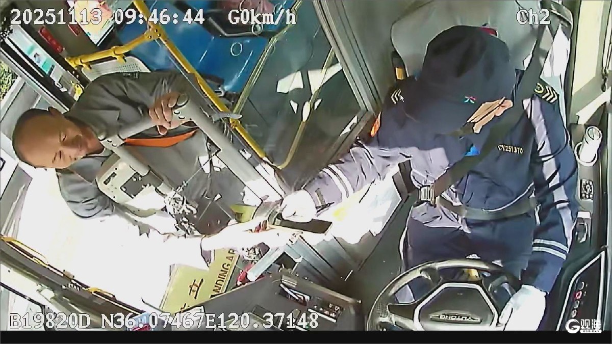 当时车厢内乘客较多,当车辆行至香港东路云岭路路口等信号灯时,柳斌发现视线被完全遮挡。他立即切换观察方式,借助车载监控系统继续关注老人。就在这时,监控画面显示老人正试图提前起身准备下车。柳斌立即温声提醒:“师傅,先坐下,到了站再站起来,安全第一。”