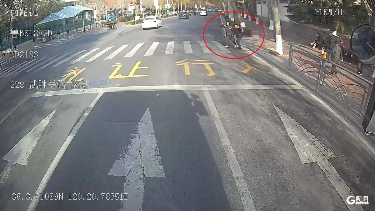 无独有偶,次日9时35分,228路驾驶员袁德新也经历了类似暖心一刻。他驾驶车辆行驶至中山公园附近的一处无信号灯斑马线时,发现有两名老人因车流密集,正小心翼翼地站在路边等待过街机会。