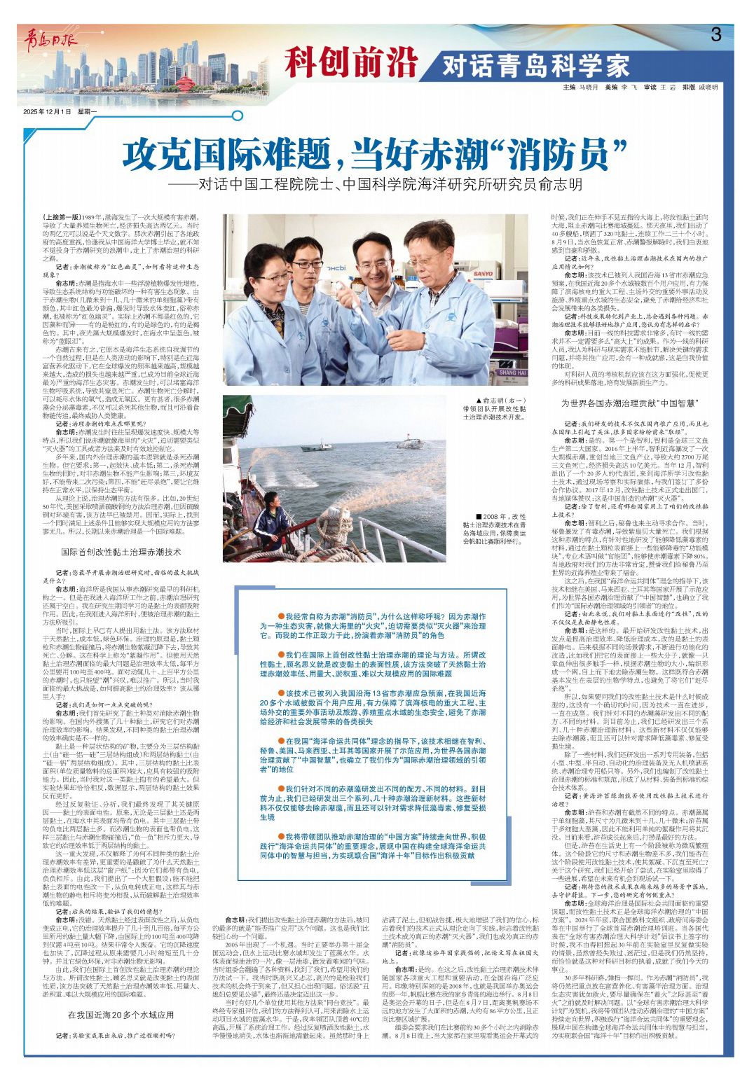 俞志明:全球海洋治理是国际社会共同面临的重要课题,而改性黏土技术正是全球海洋赤潮治理的“中国方案”。2024年年底,联合国教科文组织、政府间海委会等在中国举行了全球首届赤潮治理培训班。当各国代表在“全球有害赤潮治理大科学计划”倡议书上签字的时候,我不由得回想起30年前在实验室里反复做实验的情景,虽然曾经失败过、迷茫过,但是我们仍然坚持,而恰恰就是这种对科研目标的执着,成就了我们今天的事业。