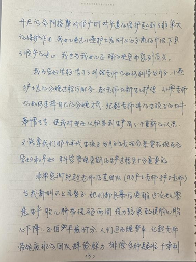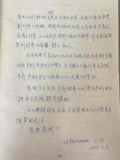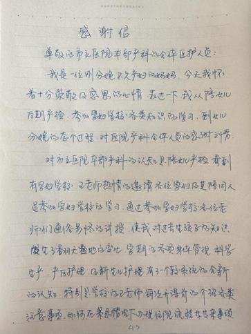 王阿姨在信的结尾写道:“无法用语言表达女儿的这次分娩过程及前期孕检过程产科老师们的努力,充分展示了咱们市立医院本部产科医生的医者仁心,大爱的情怀。”她特别感谢了医院培养的优秀产科团队,并表示:“女儿在医院得到了很好的照护,作为家长我感到非常的温馨、舒心、放心。”