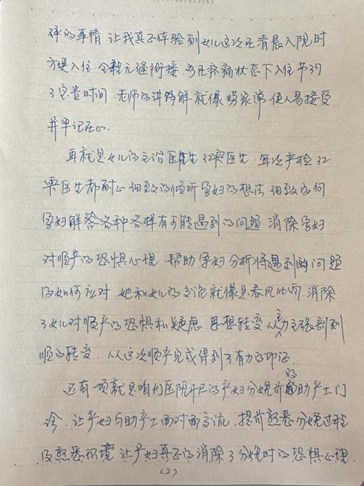 王阿姨不仅认真学习,更将所学知识应用于实践。在孕妇学校了解到产后盆底康复的重要性后,她立刻意识到年龄较大的女性更应重视盆底健康,随即挂了胡海燕主任的盆底康复门诊接受了专业评估与康复指导。在女儿分娩方式的选择上,王阿姨也发挥了重要作用。她陪同女儿参加了产科免费的助产士门诊,“让产妇与助产士面对面交流,提前熟悉分娩过程及熟悉环境让产妇真正的消除了分娩时的恐惧心理,会阴按摩对顺产时对产道的保护起到了非常大的保护作用。我女儿通过李晓燕护士长耐心的交流及介绍,下了顺产的决心。我也为我女儿正确的决定而感到高兴。”她在信中欣慰地写道。