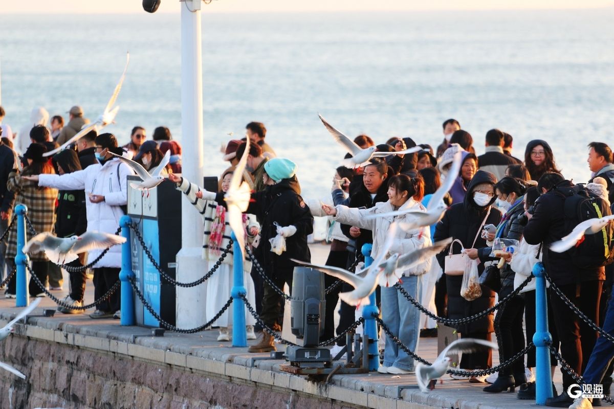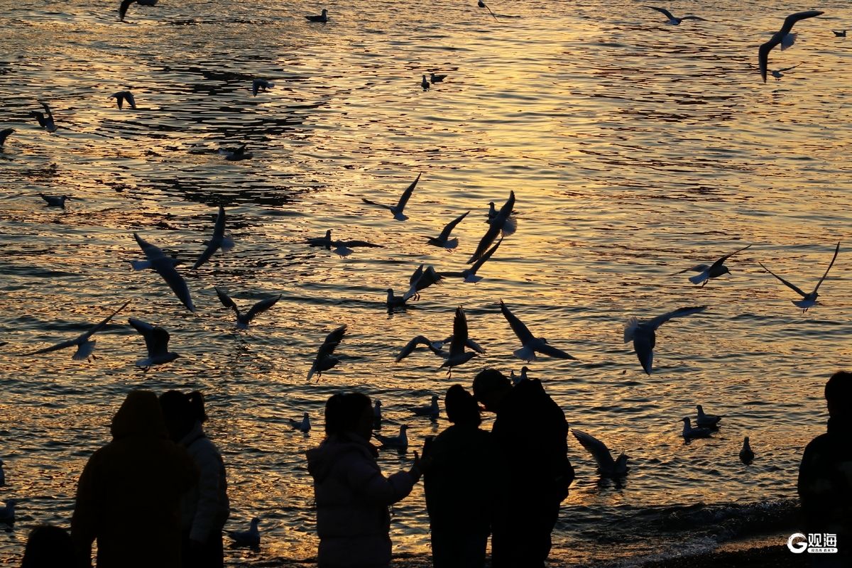 青岛日报社/观海新闻12月6日讯 暮色为青岛栈桥镀上暖金,夕阳正缓缓沉下……成群的海鸥舒展翅膀、自由翱翔起舞。游客们踮脚抬手,投喂海鸥,笑声随海风传递;情侣并肩而立,让落日与飞鸟定格成合影里的温柔背景。