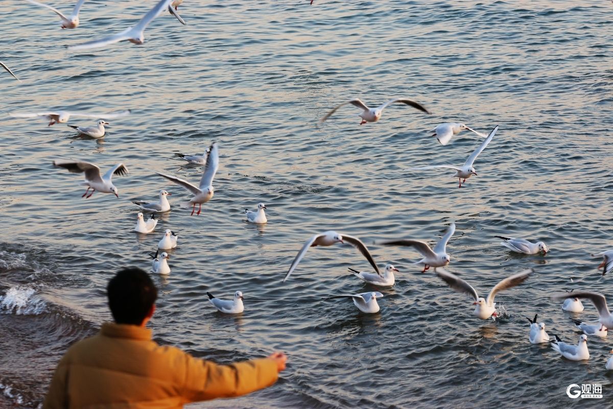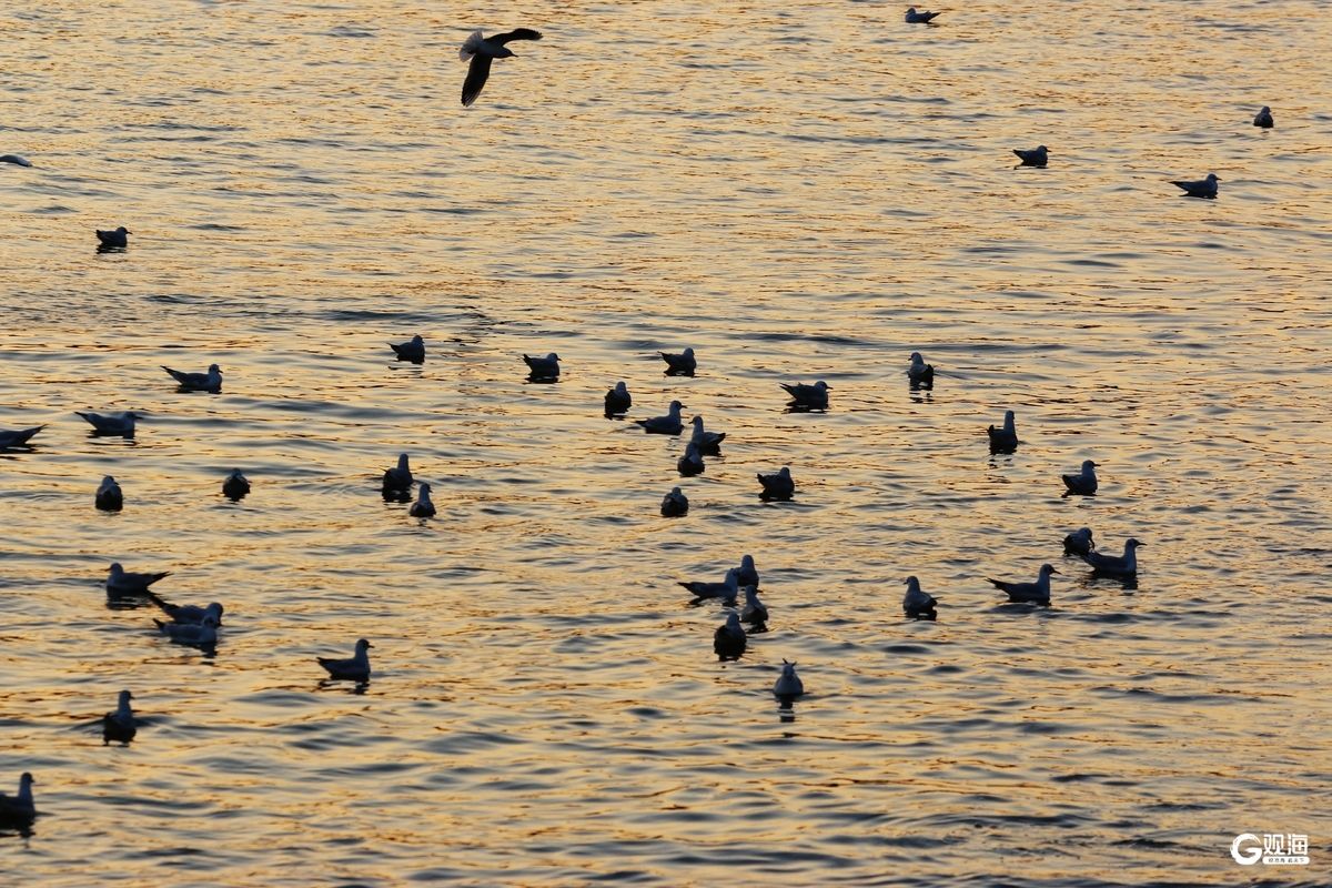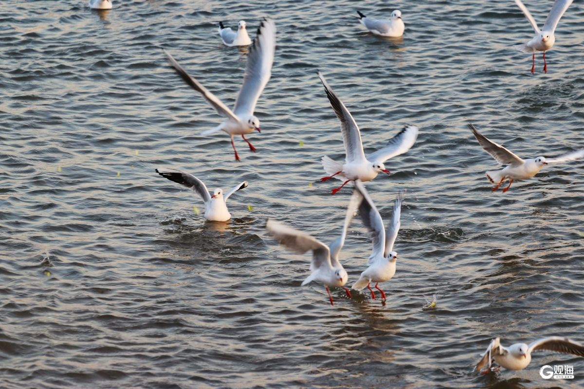 成群的海鸥舒展翅膀、自由翱翔起舞。
