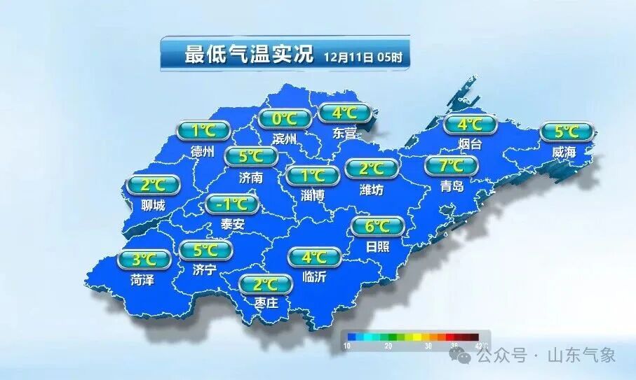 寒潮对山东的影响已经展开,从11日05时的最低气温实况来看,我省大部地区在5℃以下。