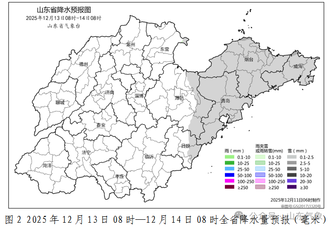 预计未来三天受两次较强冷空气影响,北风风力较大,气温持续下降。14日早晨鲁西北和鲁中地区,最低气温可降至-10~-8℃。12—13日全省自西向东有一次降雪天气,西部地区将签收本轮降雪的第一波雪花。