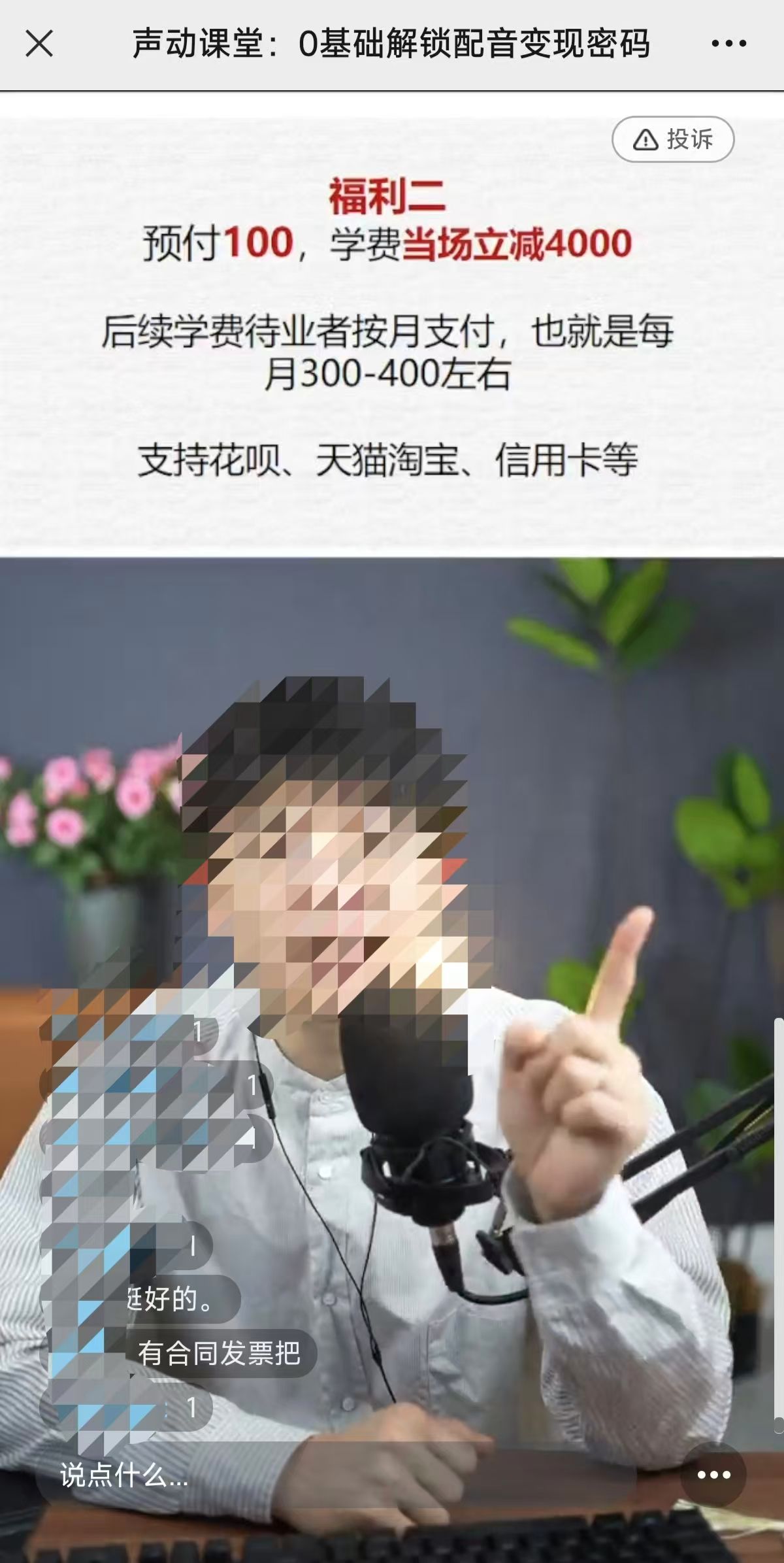 无独有偶,记者在网上刷到另一则《不限学历,副业日赚百米,有声配音员培训0元学》的广告,标注为某音频分享平台官方基础培训。记者点击报名后,该机构李老师联系到记者,推荐“0元免费5天培训”。记者同样参加了该培训课程。前期,老师确实讲解了基础的发声技巧,但从第三天开始,就不断强调接单门槛:“现在平台试音竞争大,没经过专业培训根本中不了单。我们和某平台合作的进阶班,6380元立减2000元,只要4380元,学完直接走平台绿色通道,保证有流量扶持。”